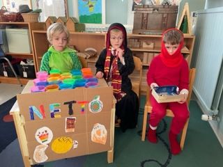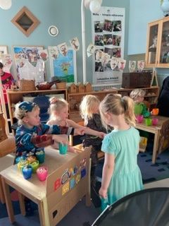 Það var mikð fjör í húsinu í dag og við héldum upp á daginn með balli á Lundi. Eftir nokkra dansa var kötturinn sleginn úr kassanum og að því loknu var boðið upp á popp og kex. Elstu börnin útbjuggu búðir, Nettó og Bónus, á torginu og börnin fóru þangað og keyptu popp eða kex.