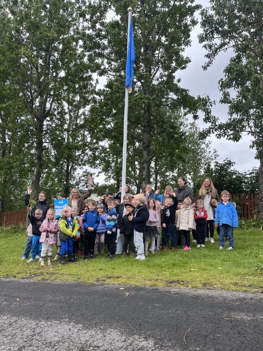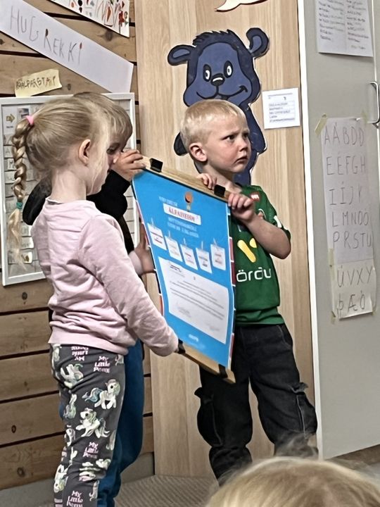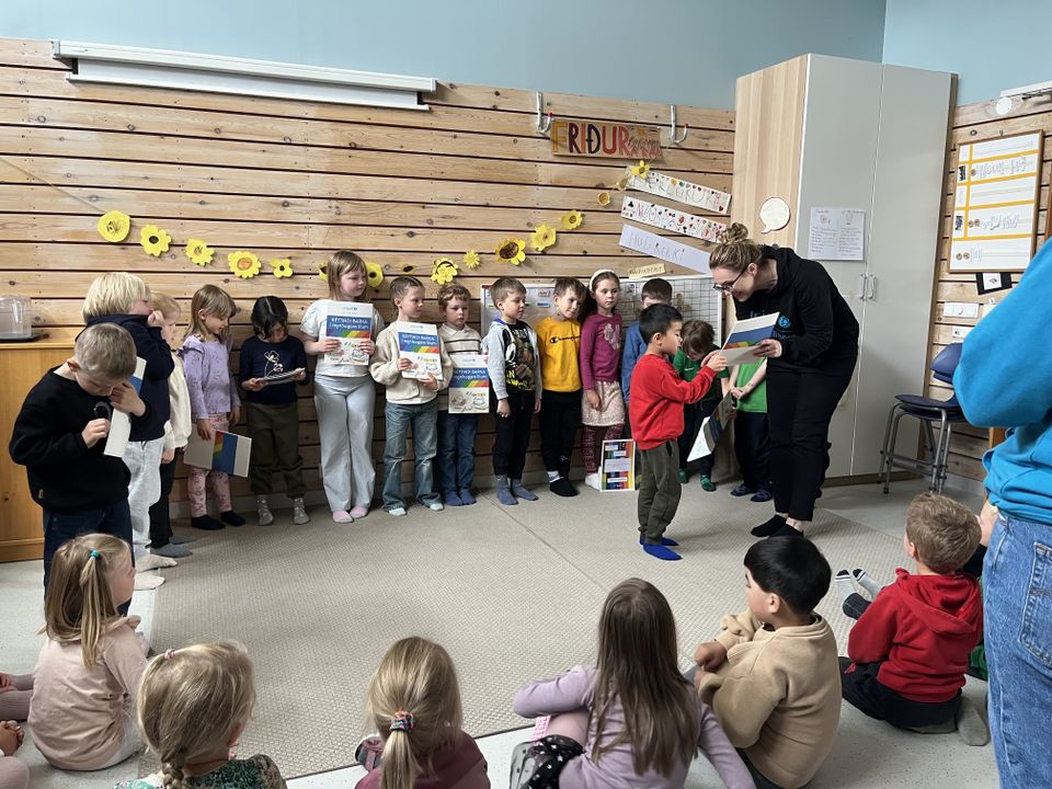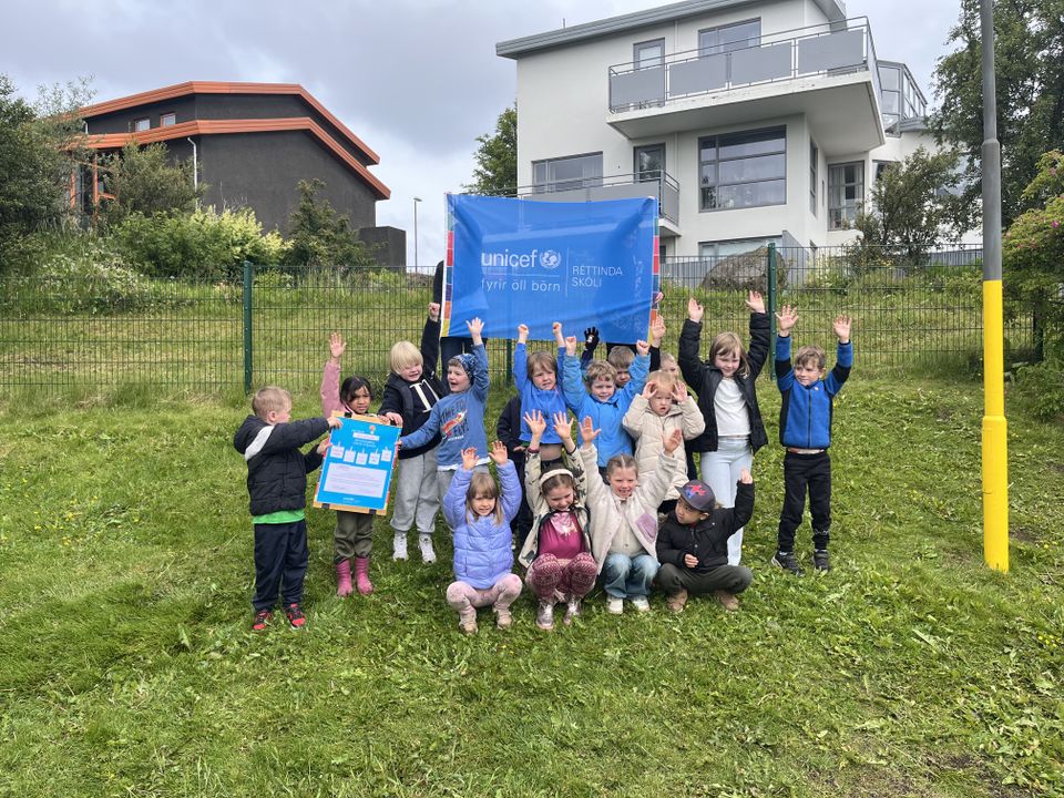 Svo tókum við á móti Réttindaskólaviðurkenningu við hátíðlega athöfn (í annað sinn) og elstu börnin, sem sitja í réttindaráði, fengu sérstaka viðurkenningu og litabók að gjöf frá UNICEF.