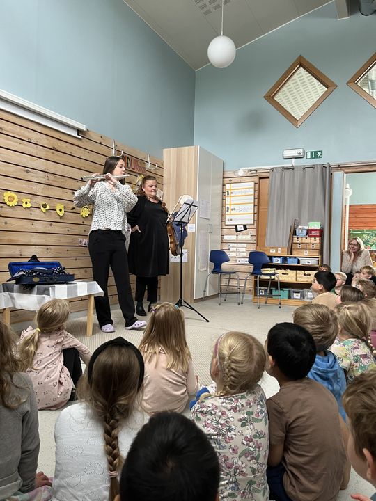 Það var mikið um að vera á föstudaginn síðasta, en dagurinn byrjaði á fagnaðarfundi þar sem Aðalheiður þverflautuleikari (gamall nemandi í Álfaheiði og núverandi starfsmaður í vinnuskólanum) og mamma hennar Jónína (fyrrverandi víóluleikari í Symfóníuhljómsveit Íslands) spiluðu fyrir börnin og kynntu hljóðfærin sín.